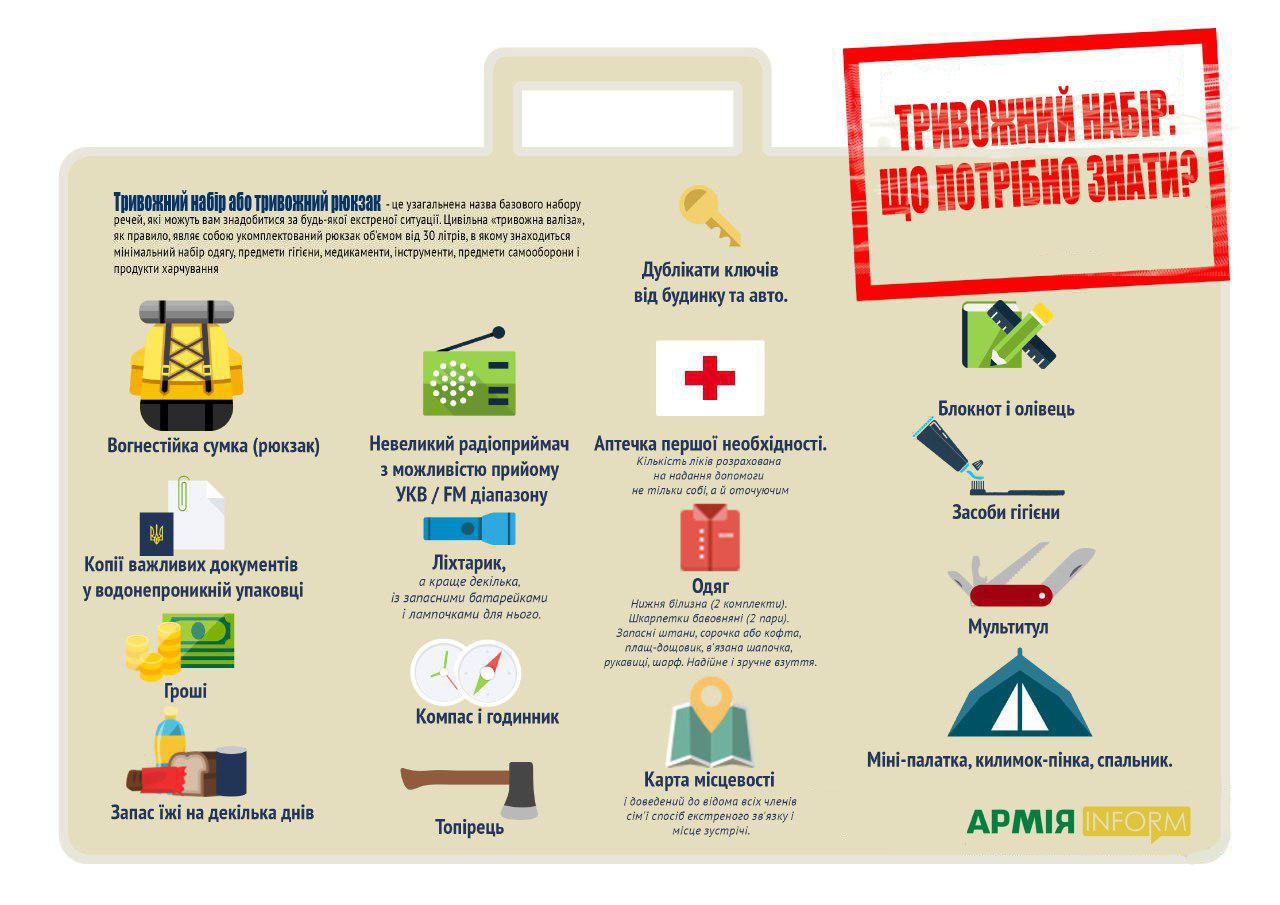 Тревожный набор — это обобщенное название базового набора вещей, которые могут понадобиться в любой экстремальной ситуации. Этот набор, как заведено, и есть укомплектованный рюкзак объемом от 30 литров с минимальным комплектом одежды, предметами гигиены, медикаментами, средствами самообороны, инструментами и пищевыми продуктами. Все вещи в тревожном рюкзаке должны быть новыми, а также не использованным в повседневном быту, пишет armyinform.