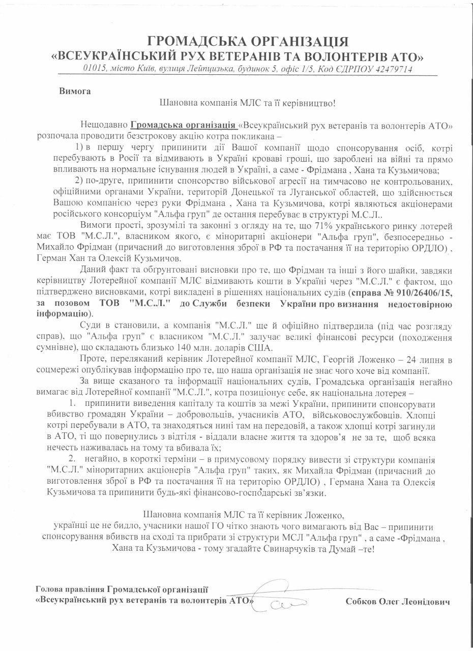 В пятницу, 26 июля, активисты ОО "Всеукраинское движение ветеранов и волонтеров АТО" пришли на встречу к руководителю "М.С.Л.", куда он сам их пригласил, но выходить отказался.