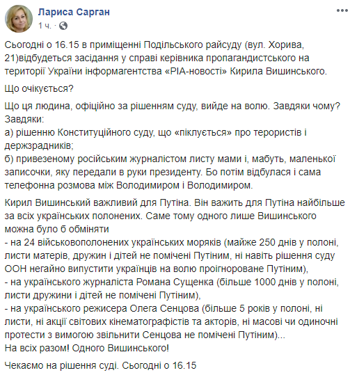 "Сегодня в 16:15 в помещении Подольского райсуда состоится заседание по делу руководителя пропагандистского на территории Украины информагентства "РИА-Новости" Кирилла Вышинского. Что ожидается? Что этот человек, официально по решению суда, выйдет на свободу", - написала Сарган.