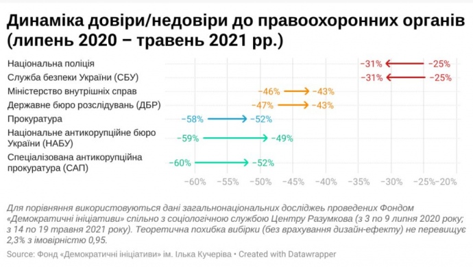 Фонд "Демократические инициативы им. Илька Кучерива" и социологическая служба Центра Разумкова провели опрос среди украинцев относительно их отношения к правоохранительным органам. Оказалось, что в течение неполного года недоверие к Нацполиции и СБУ выросло с 25% до -31%. Для Министерства внутренних дел показатель несколько изменился в положительную сторону - от - 46% до -43%, в ГБР - от - 47% до -43%, в САП - от - 60% до -52%.