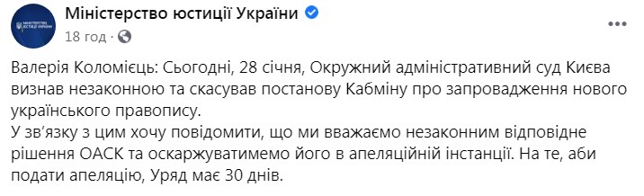 Решение Окружного административного суда Киева, который отменил редакцию, будет обжаловано. Об этом 29 января сообщила в "Фейсбуке" заместитель министра юстиции Валерия Коломиец.