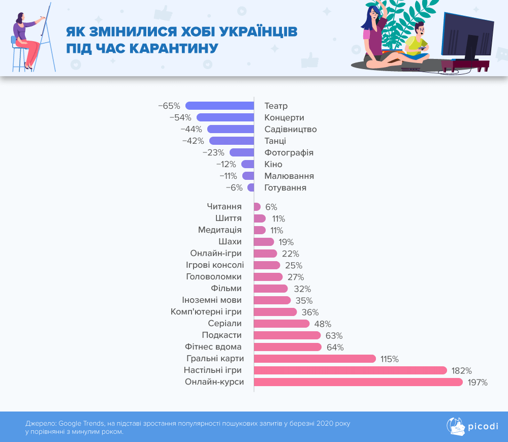 Аналитики сайта Picodi проанализировали статистику поисковых запросов в Google и составили список занятий, которые больше всего интересны украинцам в период вынужденной домашней изоляции. Специалисты сравнили поисковые запросы различных видов культурного отдыха с аналогичными в марте прошлого года. Как показала статистика, интерес к большинству занятий, предусматривающих выход из дома, значительно сократился: запрос "театр" искали на 65% меньше, чем в прошлом году, "концерты" - на 54%, "танцы" - на 42%, "фотография" - на 23%. Также на 44% уменьшилось количество людей, интересующихся садоводством.
