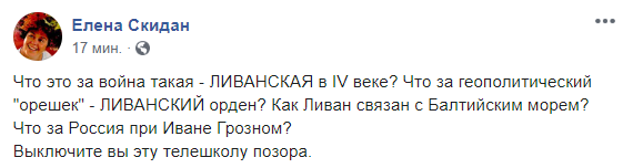 "Что за геополитический" орешек " - Ливанский орден Как Ливан связан с Балтийским морем? Что за Россия при Иване Грозном? Отключите вы эту телешколу позора", - пишет Скидан.