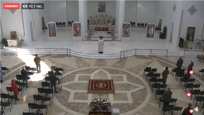 Например, сейчас литургию только на Facebook просматривают одновременно 10 тыс. человек. Итого на платформах трансляции канала охватывают до 30 тыс. Человек одновременно. При этом в храме есть посетители, которых, как видно на видео, разместили на расстоянии более 2 м друг от друга.