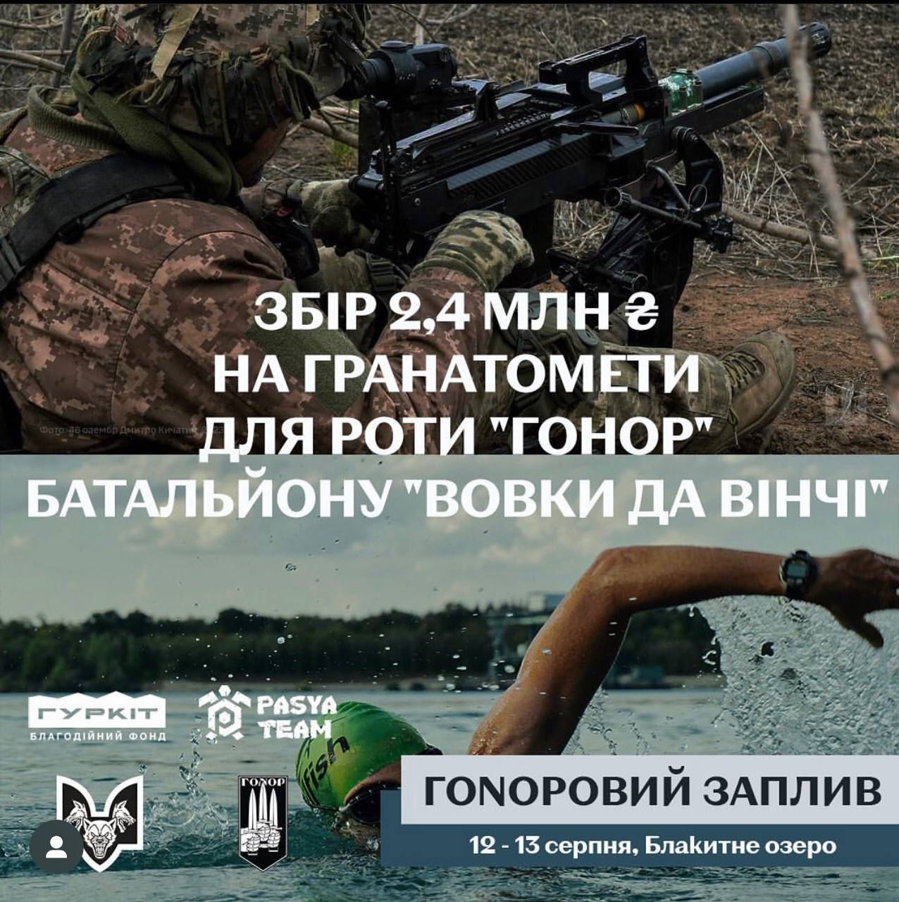 Чтобы усилить сбор, спортивная команда Pasya Team организовала благотворительный заплыв: 12-13 августа (дистанции 6, 3 и 1 км), он прошел недалеко от Киева в с. Подгорцы (Голубое озеро). Каждый финишер получил уникальную награду — гильзу, изготовленную из трофейных снарядов трофейного БТР-82А, который мы захватили во время освобождения пгт Купьянсье-Узловой.