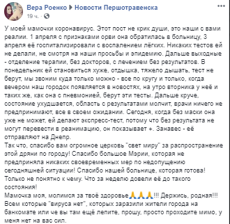 "9 апреля, когда без маски она уже не может, ей делают экспресс-тест, потому что без результата не могут перевести в реанимацию, он показывает "+". Ее отправляют в Днепр", – рассказывает Вера Роенко. Девушка добавила, что ее мать "довели до такого состояния за неделю".