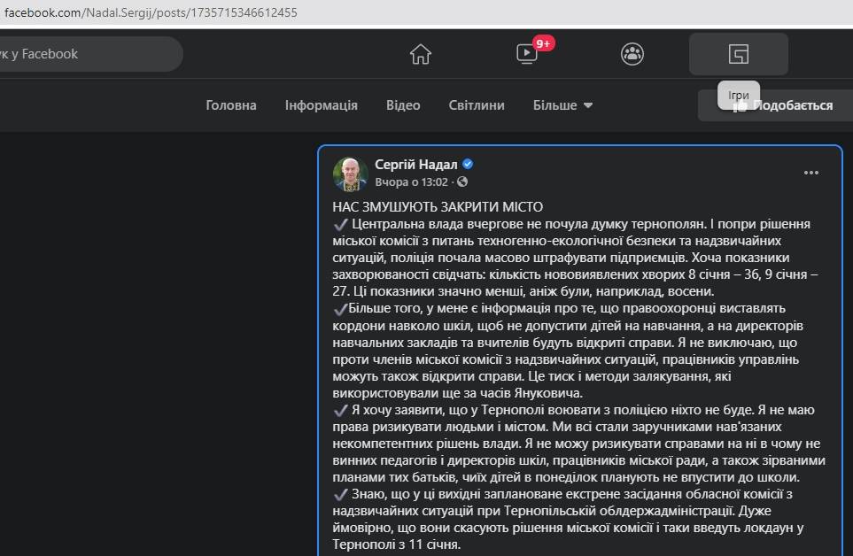 Сергей Надал считает, что в Тернополе таки введут локдаун с 11 января. Об этом он написал в Facebook накануне.