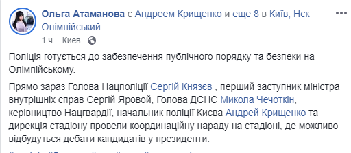 "Полиция готовится к обеспечению общественного порядка и безопасности на "Олимпийском". Прямо сейчас Председатель Нацполиции Сергей Князев, заместитель министра внутренних дел Сергей Яровой и Председатель ГСЧС Николай Чечеткин провели координационное совещание на стадионе, где возможно состоятся дебаты кандидатов в президенты", - сообщила она.