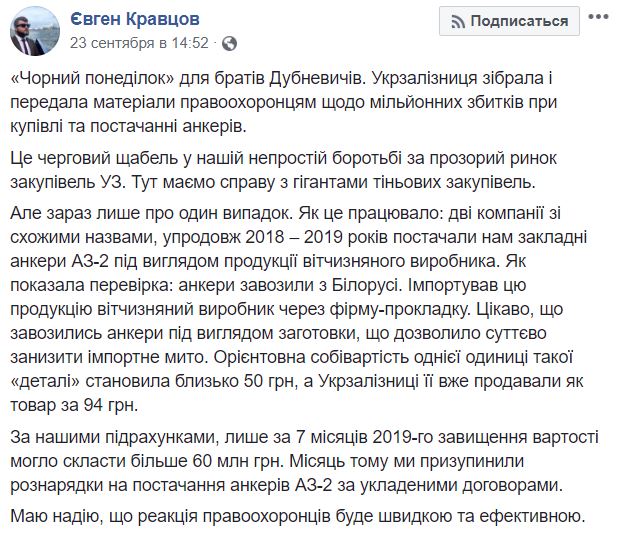 В заявлении Кравцова, в частности, говорится, что "Укрзализныця" передала в Службу безопасности Украины доказательства того, что компании, связанные с депутатами Верховной Рады предыдущего созыва Ярославом и Богданом Дубневичами, нанесли УЗ ущерб на более чем 60 миллионов гривен.