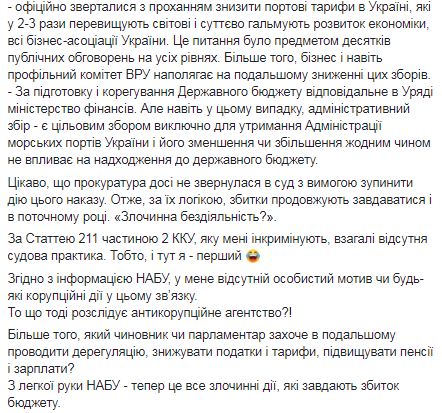 "По статье 211 части 2 УК, которую мне инкриминируют, вообще отсутствует судебная практика. То есть, и здесь я - первый. Согласно информации НАБУ, у меня отсутствует личный мотив или любые коррупционные действия в этой связи. Что тогда расследует антикоррупционное агентство?! ", - написал Омелян.