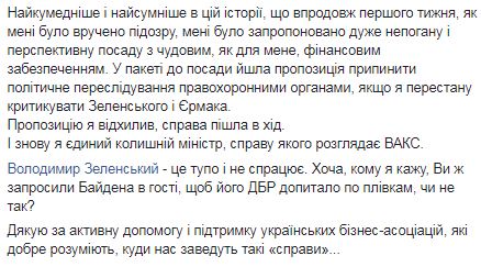 "Самое смешное и самое печальное в этой истории, что в течение первой недели, как мне вручили подозрение, мне было предложена очень неплохая и перспективная должность с прекрасным, как для меня, финансовым обеспечением. В пакете с должностью шло предложение прекратить политическое преследование правоохранительных органов, если я перестану критиковать Зеленского и Ермака", - рассказал экс-чиновник.