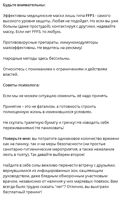 "Принятие – это не фатализм, а готовность строить полноценную жизнь в изменившихся условиях. Не скупать туалетную бумагу и гречку! Не изводить себя переживаниями! Не паниковать! Поверьте мне: вы потратите одинаковое количество времени как на панику, так и на меры безопасности (на простые санитарно-гигиенические мероприятия, а также нежелание лезть в толпу). Так давайте выберем второе", - отмечает бизнесмен.