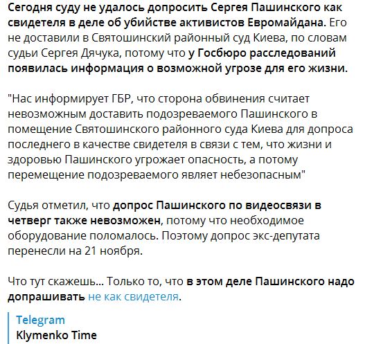 Пашинского не доставили в Святошинский районный суд Киева. По словам судьи Сергея Дячука, это произошло, потому что у Госбюро расследований появилась информация о возможной угрозе для его жизни, сообщает Telegram-канал Klymenko Time.