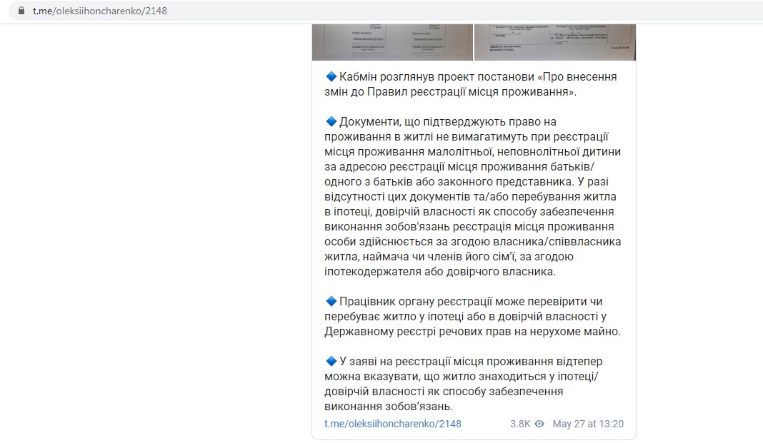 Кабинет министров пересмотрел правила прописки в Украине. Об этом сообщил народный депутат Украины Алексей Гончаренко в Telegram в среду, 27 мая.