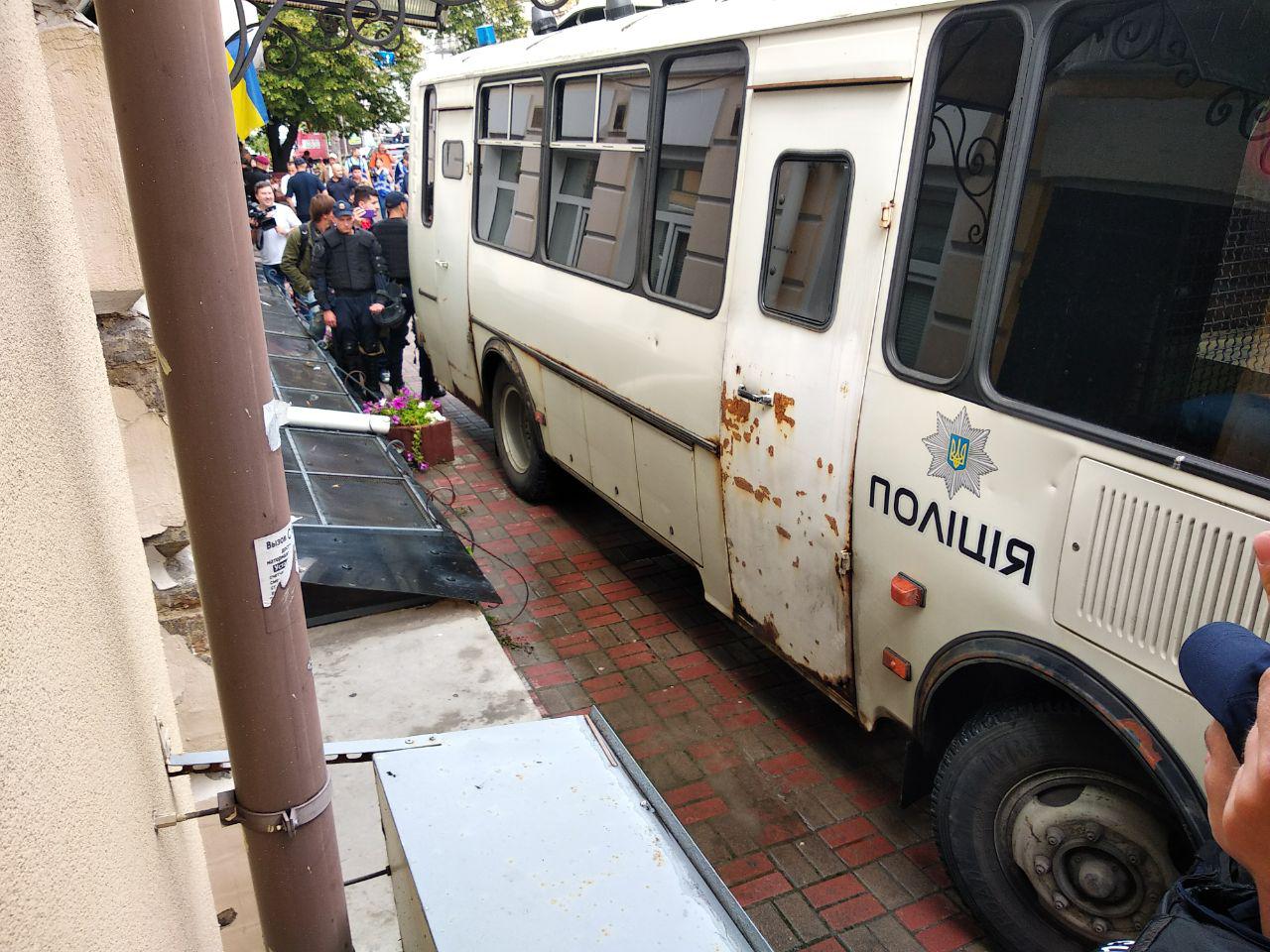 Еще до начала акции работники полиции заблокировали вход в суд автобусом.