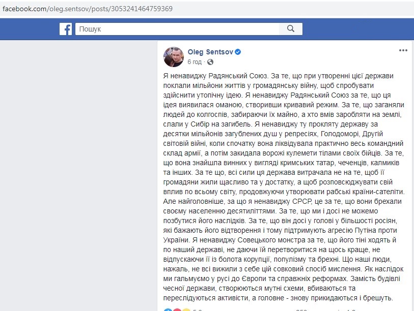 "Я ненавижу Советского монстра за то, что его тени ходят и по нашему государству, не давая ей превратиться в нечто лучшее, не отпуская его из болота коррупции, популизма и лжи. Что наши люди, к сожалению, не все выжили из себя этой совковый способ мышления. Как следствие мы тормозим в движении в Европу и настоящих реформах. Вместо строительства честного государства, создаются мутные схемы, убиваются и преследуются активисты, а главное - снова притворяются и лгут", – подытожил Сенцов.