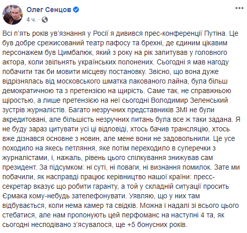 Сравнив конференции в Москве и Киеве Сенцов признал, что брифинг Зеленского отличался от кремлевской постановки "претензией на искренность". " Именно так, не настоящей искренностью, а лишь претензией на нее сегодня Владимир Зеленский встретил журналистов", - написал в своем сообщении Олег Сенцов.