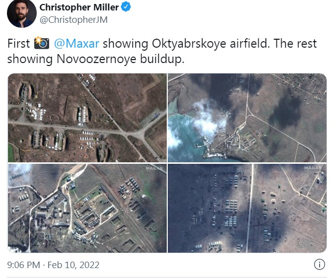 В Крыму 10 февраля на аэродроме Октябрьское наблюдалась новая большая дислокация техники и войск. На этот заброшенный аэродром севернее Симферополя прибыло более 550 военных палаток и сотни единиц техники. Также на территории оккупированного полуострова авиация РФ проводит учения, чтобы атаковать южные украинские города.