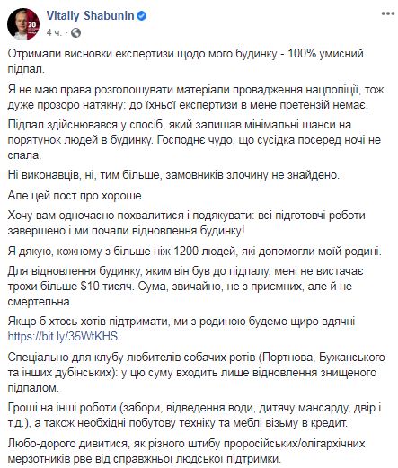 "Получили выводы экспертизы в отношении моего дома -100% умышленный поджог. Я не имею права разглашать материалы производства Нацполиции, поэтому очень прозрачно намекну: к их экспертизе у меня претензий нет", - отметил он.