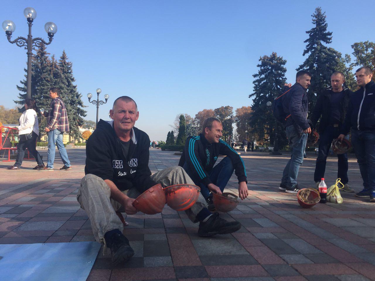 Около 50 шахтеров в знак протеста бьют касками об асфальт на площади Конституции, перед Верховной Радой.