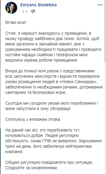 "Итак, я наконец нахожусь в помещении, в котором проведу ближайшие две недели. Хотела, чтобы меня заселили в обычной комнате, но с учетом необходимости работать и проводить постоянные совещания по скайпу и телефону мне выделили отдельное рабочее помещение. Вчера до поздней ночи вместе с представителями всех привлеченных министерств и ведомств проверяли условия размещения людей в "Новых Санжарах", обеспечение их необходимыми вещами, соблюдение санитарных норм и норм безопасности. Сегодня мы согласовали условия моего пребывания и меня запустили в зону обсервации", - написала Скалецкая.
