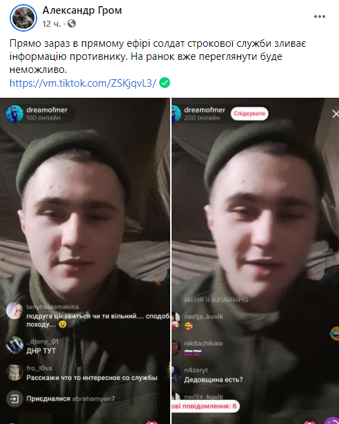 "Прямо сейчас в прямом эфире солдат срочной службы сливает информацию противнику. Утром уже посмотреть будет невозможно", - написал Гром и добавил, что сам солдат родом из Славгорода Днепропетровской области, он проходит службу в Купянске Харьковской области. Как рассказали другие комментаторы, солдат сказал, что пошел служить в ВСУ из-за того, что "родители сказали, что там хорошо платят", а в политике он "нейтральный".
