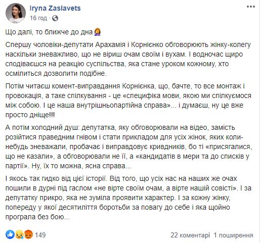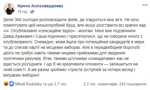 Начнем с самой Ирины Аллахвердиевой. Она отреагировала в Facebook на скандал сдержанным заявлением, в котором отметила, что видео - это "монтаж", а Корниенко с Арахамией ей уже позвонили и "поклялись, что не говорили ничего из опубликованного". Она добавила, что, по ее мнению, скандал был создан искусственно, чтобы вызвать раскол во фракции "Слуга народа", и заявила, что оппонентам сделать это не удастся.