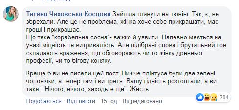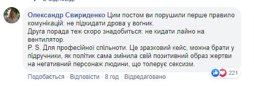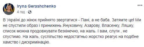 Депутат от "ЕС" Ирина Геращенко заявила, что ее партия "не спустит" такой обиды в адрес женщины. Она также отметила, что общество реагирует на такую дискриминацию "недостаточно жестко".