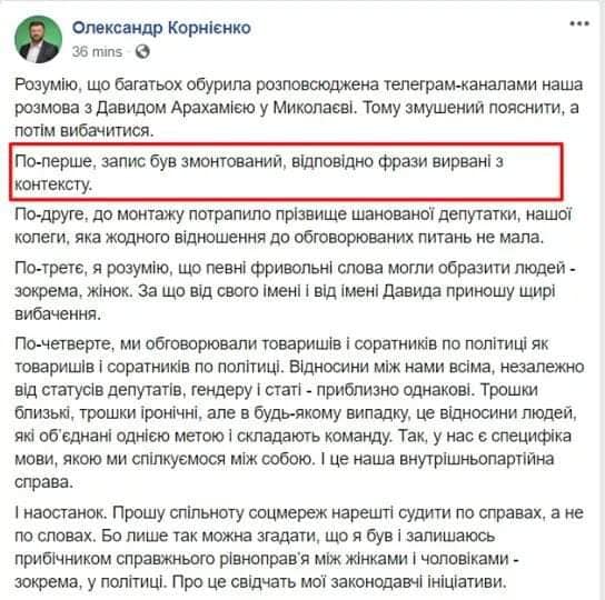 Александр Корниенко, который, собственно, и был автором всех оскорбительных высказываний в адрес депутата, опубликовал в соцсетях то ли опровержение, то ли извинения... Из его поста так и не понятно, действительно ли он это говорил - или все же это был "монтаж".