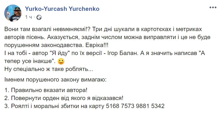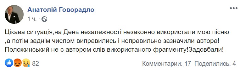 Заслуженный артист Украины, поэт и музыкант Анатолий Говорадло написал на своей странице в Facebook, что на День Независимости незаконно использовали его песню, а потом задним числом исправились и неправильно отметили автора.