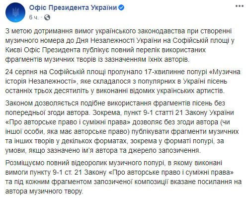 В Офисе президента Украины заявили, что законом разрешается использование фрагментов песен без предварительного согласия автора. Напомним, 24 августа, в День Независимости, на Софийской площади прозвучало 17-минутное попурри "Музыкальная история Независимости", которое состояло из популярных в Украине песен последних трех десятилетий в исполнении известных украинских артистов. В ОПУ отметили, что законом разрешается без согласия автора публиковать фрагменты музыкальных и других произведений в нескольких форматах, в том числе в формате попурри, при условии, если указано имя автора и источник заимствования.