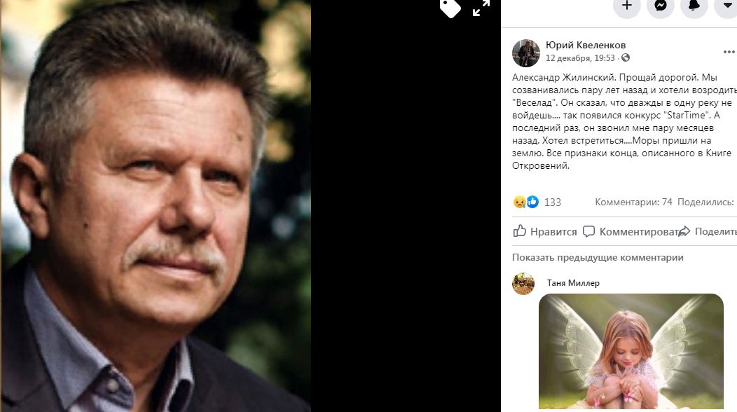 "Прощай дорогой. Мы созванивались пару лет назад и хотели возродить "Веселад". Он сказал, что дважды в одну реку не войдешь.... так появился конкурс "StarTime". А последний раз, он звонил мне пару месяцев назад. Хотел встретиться....Моры пришли на землю. Все признаки конца, описанного в Книге Откровений", - написал Квеленков.