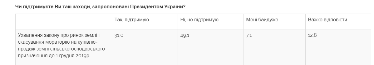 31% украинцев поддерживает предложение о принятии закона о рынке земли и отмены моратория на куплю-продажу земли сельскохозяйственного назначения до 1 декабря 2019г.