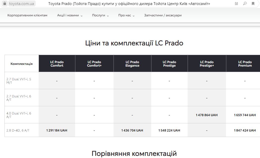 Известно, что данное предприятие находится в подчинении Киевской городской государственной организации. На сайте официального дилера Toyota стоимость Land Cruiser Prado Prestige+ равна 1,47 миллиона гривен.