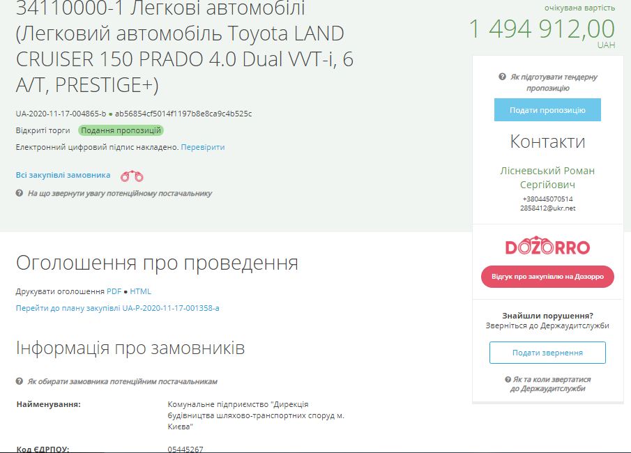Внедорожник Toyota Land Cruiser Prado может пополнить гараж коммунального предприятия "Дирекция строительства дорожно-транспортных сооружений". Заявка о покупке автомобиля появилась на сайте ProZorro.