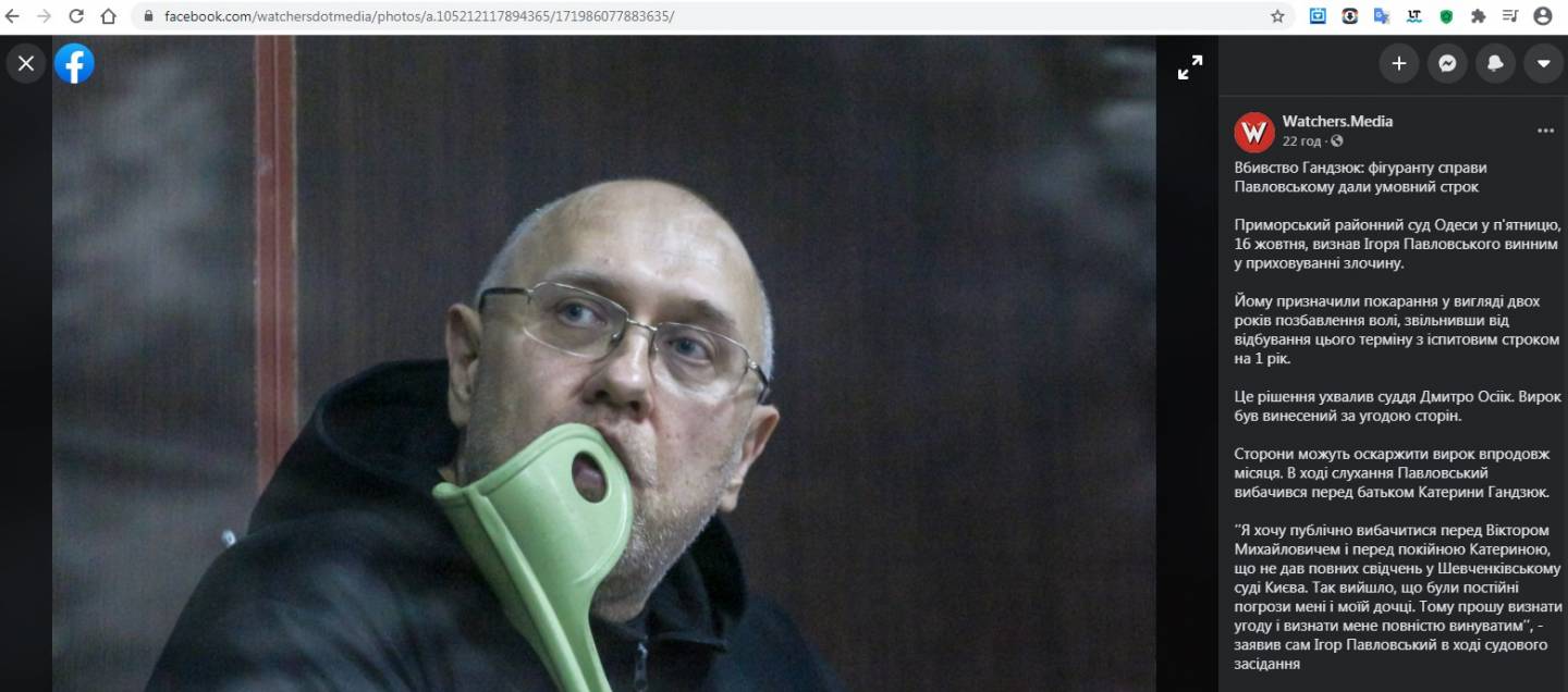 Приморский районный суд Одессы признал Игоря Павловского виновным в сокрытии преступления против херсонской активистки Екатерины Гандзюк. Ему назначено наказание в виде двух лет лишения свободы с испытательным сроком в 1 год.