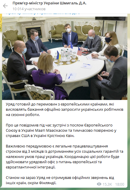 По словам главы правительства Украины, во время диалога шла речь о легальном трудоустройстве сроком от трех месяцев с соблюдением всех социальных гарантий и условий труда украинцев. По словам Дениса Шмыгаля, правительственный офис по вопросам европейской и евроатлантической интеграции будет осуществлять координацию этой работы. В данный момент Украина получила официальное обращение от Финляндии.