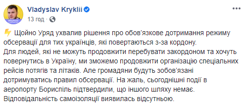 "Правительство приняло решение об обязательном соблюдении режима обсервации для тех украинцев, которые возвращаются из-за границы. Для людей, которые не могут продолжить находиться заграницей и хотят вернуться в Украину, мы сможем продолжить организацию специальных рейсов поездов и самолетов. Но граждане будут обязаны соблюдать правила обсервации", - пишет Криклий в своем сообщении.
