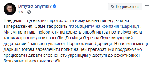 "До конца марта будет выпущен дополнительный 1 миллион упаковок Парацетамол-Дарница. В последующие месяцы Дарница готова обеспечить спрос на этот препарат. Мы продолжаем работать и давать уверенность украинцам в доступе к эффективным и безопасным лекарственным средствам", - сообщил Шимкив.
