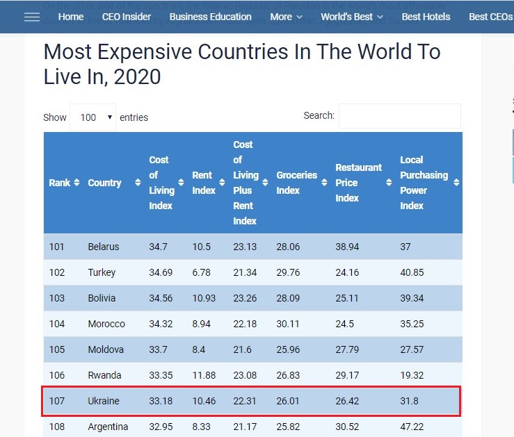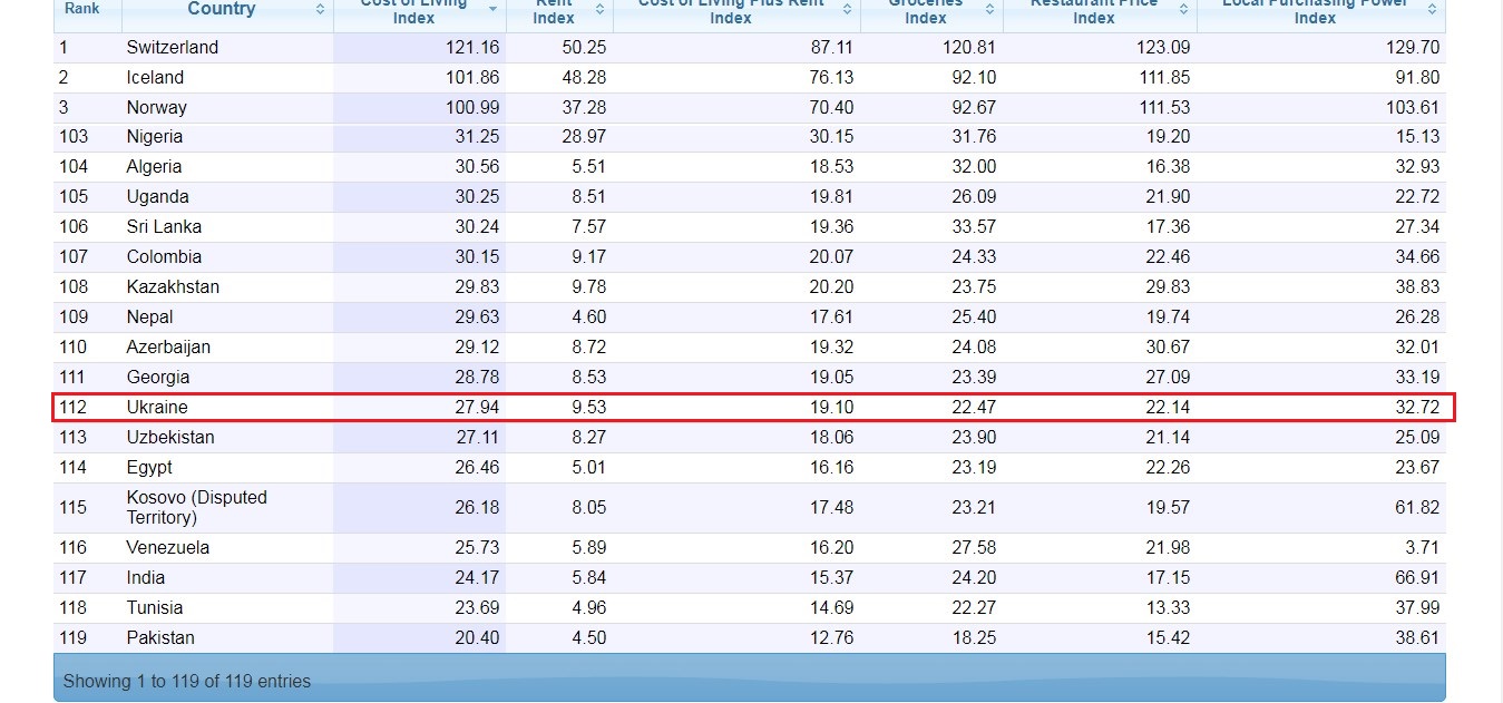 Украина заняла 107 место в списке самых дорогих для проживания стран мира