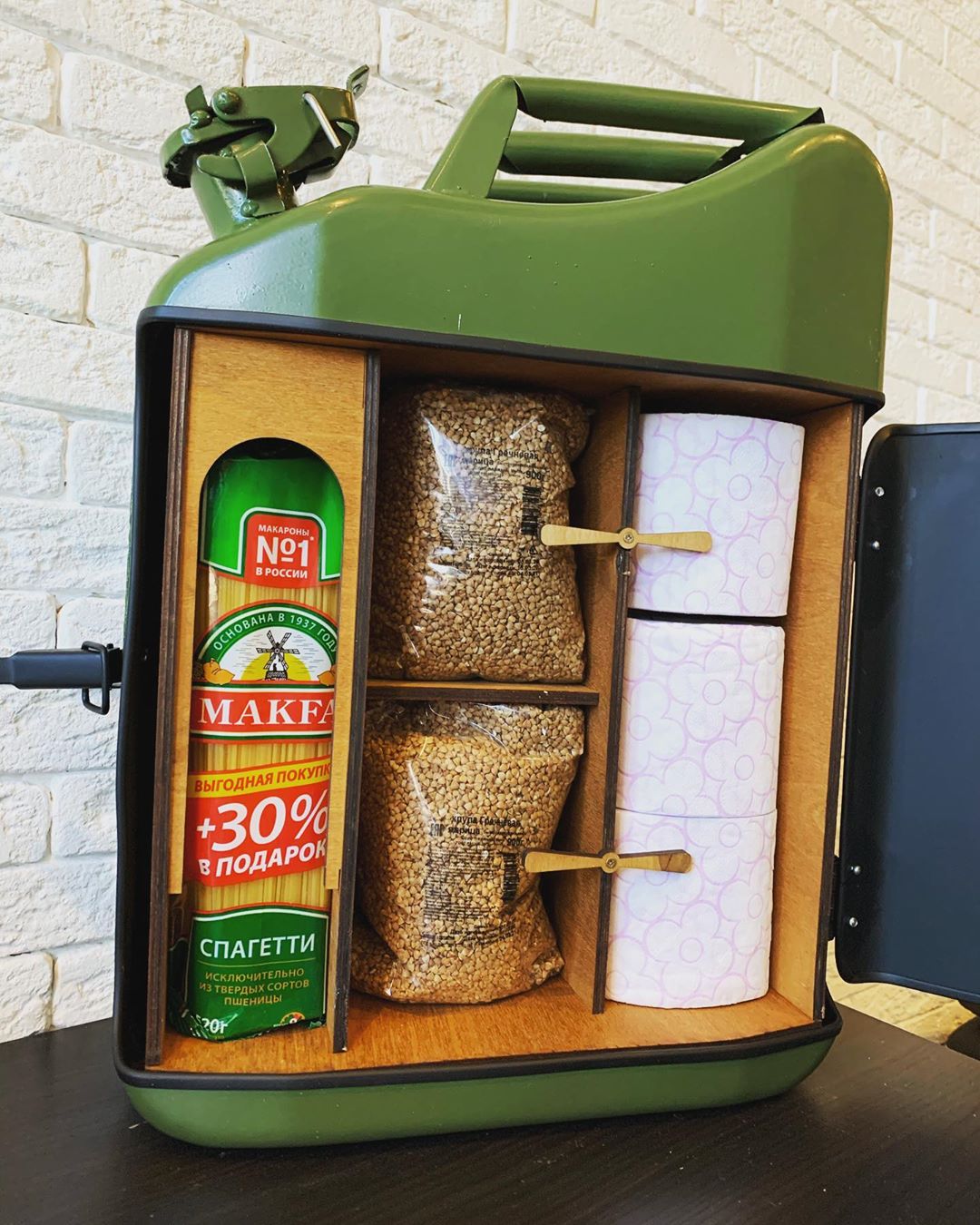 В связи с тем, что некоторые продукты переходят в разряд дефицитных, люди придумали креативный подарочный набор, который, как никогда, актуален и явно запомнится надолго. Канистру "Н3", которую раньше делали под мини-бар для алкоголя, переделали в "туалетно-гречневый тайник". Стоимость такого бара – 2 тысячи гривен.