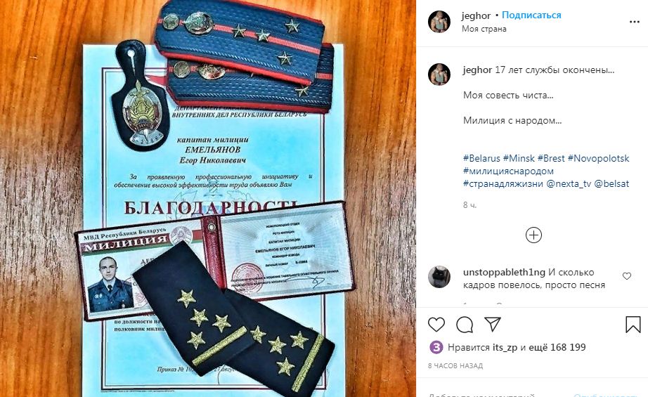 Так, ушел в отставку на фоне протестов из-за президентских выборов, капитан милиции Егор Емельянов, этом он написал на своей странице в Instagram. "17 лет службы окончены. Моя совесть чиста. Милиция с народом", - написал милиционер, также опубликовав фото своего удостоверения.