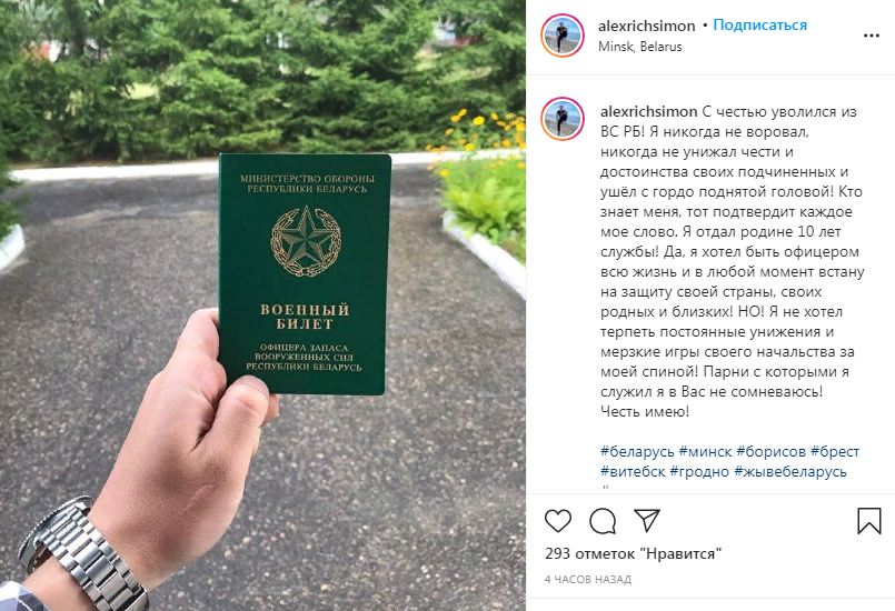 Кроме того, об уходе из армии сообщил капитан Александр Лялин. "Я отдал родине 10 лет службы! Да, я хотел быть офицером всю жизнь и в любой момент встану на защиту своей страны, своих родных и близких! НО! Я не хотел терпеть постоянные унижения и мерзкие игры своего начальства за моей спиной!" — написал он, сопроводив пост хэштегами #жывебеларусь и #армияснародом.