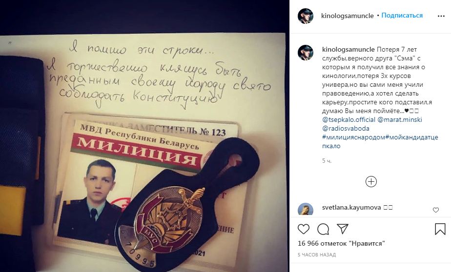 Еще один похожий пост в Instagram разместил кинолог Виктор Шаркович. "Я помню эти строки: Я торжественно клянусь быть преданным своему народу и свято соблюдать Конституцию", - пишет он, отметив, что службе отдал 7 лет своей жизни. "Я думаю, вы меня поймёте", — заключил он.