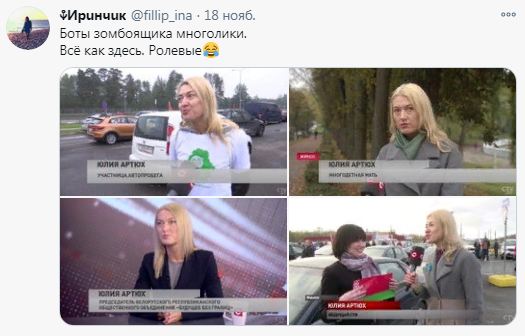 Пользователи сети высмеяли узколобость государственного телевидения Республики Беларусь, которое в разных эпизодах, описывающих ситуацию в стране, использовало одну и ту же женщину. Таким образом, персонаж человека с провластной позицией исполняла некая Юлия Артюх.