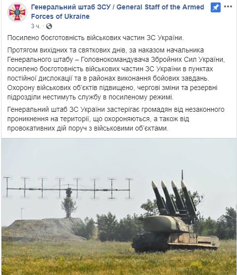"В течение выходных и праздничных дней, по приказу начальника Генерального штаба – Главнокомандующего Вооруженных Сил Украины, усилена боеготовность военных частей ВС Украины в пунктах постоянной дислокации и в районах выполнения боевых задач. Охрану военных объектов повышен, очередные изменения и резервные подразделения будут нести службу в усиленном режиме", - говорится в сообщении Генштаба ВСУ.