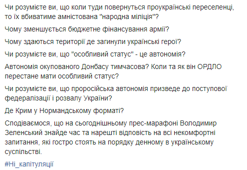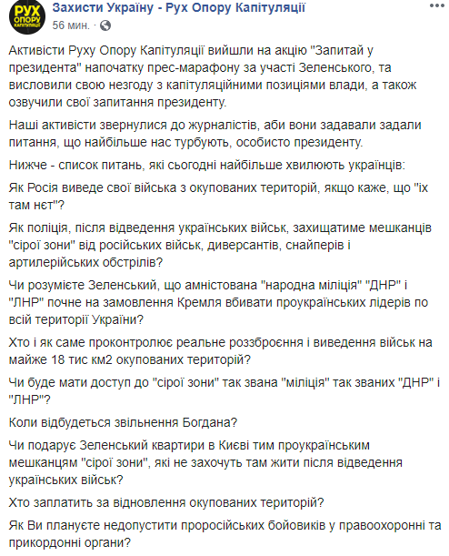 "Наши активисты обратились к журналистам, чтобы они задали вопросы, которые больше всего нас беспокоят, лично президенту", - говорится в сообщении "Движения Сопротивления Капитуляции".