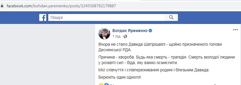 "Вчера не стало Давида Шатиришвили - только что назначенного председателя Деснянской РГА. Причина - болезнь. Любая смерть - трагедия. Смерть молодого человека в расцвете сил - беда, которую трудно осмыслить. Мои соболезнования и сочувствие семье и близким Давида", - написал Яременко.