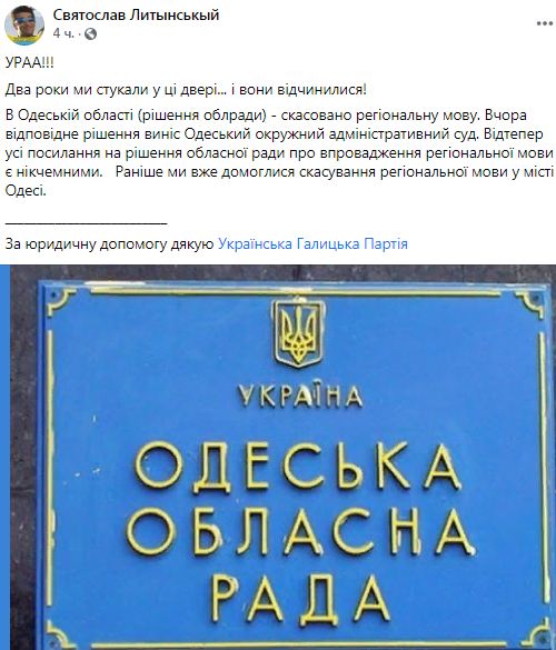 "В Одесской области (решение облсовета) - отменен региональный язык... Отныне все ссылки на решение областного совета о введении регионального языка являются ничтожными", - написал Литинский.