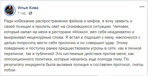 По словам автора публикации, через какое-то время Илья Кива начал "провоцировать" одного из посетителей ресторана, а также попытался ударить его головой об стол, на что посетитель "ответил" нардепу "ударом по лицу".